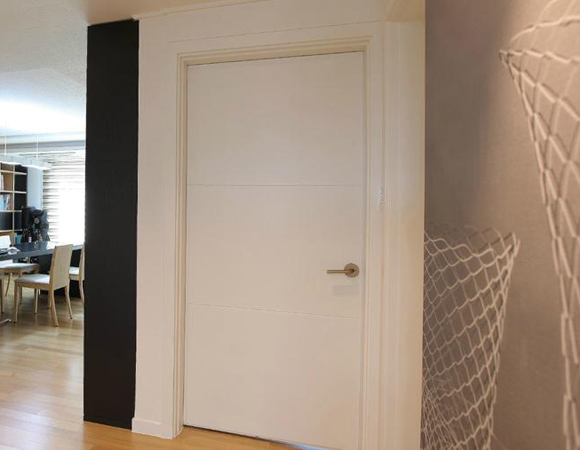 編輯點(diǎn)評(píng):寢室大門(mén)和墻壁的純白色融為一體,旁邊也用灰色背景、鋼絲花紋的壁紙裝飾,呼應(yīng)黑白灰的家居主題。