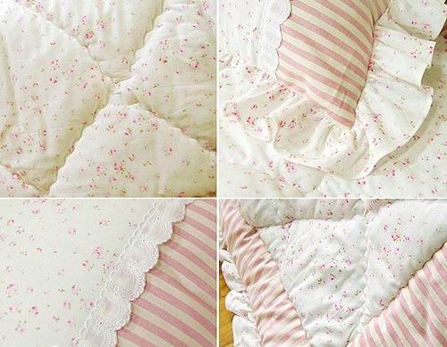 看起來柔軟舒適的白底碎花床品,搭配粉色條紋元素,顯得甜美溫馨。這款床品的格紋效果非常特別,是用絎縫作出的格紋效果,讓被子看起來更加蓬松柔軟,在冬季更能為臥室增添溫暖的效果。