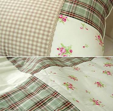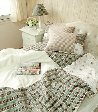 枕頭用棕色格紋為主,還用蕾絲邊做了過渡,而被子則用淺綠色作為主色調(diào),兩者交相呼應(yīng),呈現(xiàn)出春意盎然的效果。