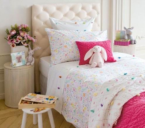 糖果色的絨球和淺色碎花圖案,讓桃紅色床品跟白色床品的搭配充滿孩童般的稚氣,讓女孩的房間充滿柔美又純正的氣息。