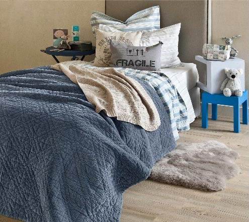 寧?kù)o的深藍(lán)色床品,搭配質(zhì)樸的亞麻靠枕,再用淺藍(lán)色條紋床單作為過(guò)渡,讓臥室充滿(mǎn)海洋般沉靜清新的氣息,這款房間無(wú)論男孩女孩都可以搭配,非常實(shí)用。