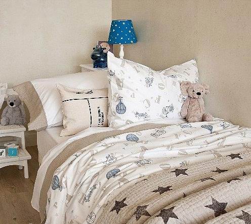 棕色帶星形圖案的床品,給人雅致溫馨的感覺(jué)。搭配白底字母圖案,增添了童趣的感覺(jué)。用亞麻材質(zhì)的枕套搭配,讓臥室平添了自然舒適的感覺(jué)。
