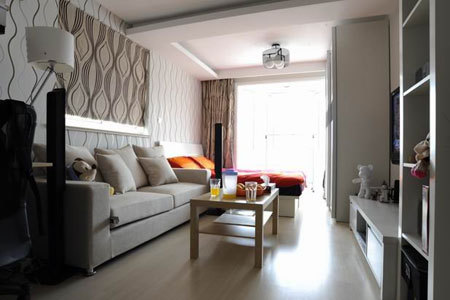 房間面積小,整體色調(diào)以淺色系為主,視覺上起到一定放大效果。拉上窗簾后的,壁布和窗簾上的花紋相互呼應(yīng),齊劃一的重復(fù)圖案也有增大視覺空間的效果。