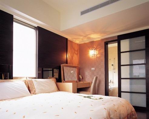 主臥浴室門片使用拉門,減少擁擠的感受;除卻原本占空間的床頭柜設置,直接在窗戶做木片開闔的妝點,就成了獨一無二的床頭設計。