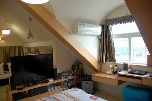 這個算是客廳了,很小,但是功能齊全。邊上做了格子,可以當(dāng)成收納,這是小戶型最重要的功能。