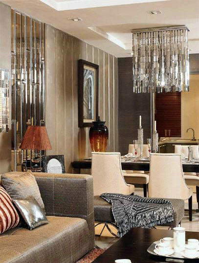雖然是一個系列的燈飾,但是在餐廳選用吊燈,在客廳選用壁燈,功能差別一下子被分開了,而且還有一種區(qū)域之間相互呼應(yīng)的感覺。