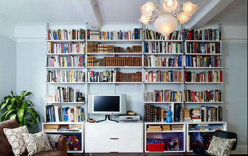 客廳采用天藍色作為搭配重點,色調(diào)柔和舒適,有助于降低視覺疲勞的程度。電視背景墻兼收納功能,大型書架上書籍放置整齊,纖長的立柱被固定在房頂?shù)淖钌厦,整個造型簡潔而又大方,讓房間盡顯年輕時尚。
