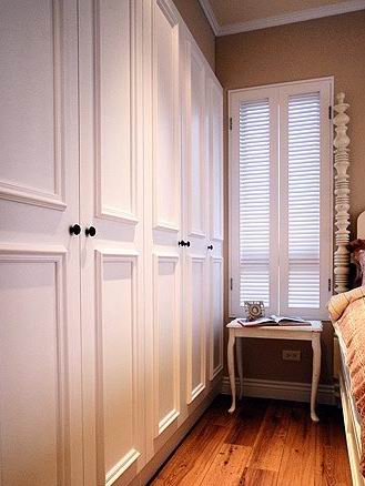 大衣柜采用了簡潔的白色線板,大氣而又典雅。床頭柜也同樣采用了簡潔優(yōu)雅的造型,共同營造出甜美浪漫的睡眠空間。