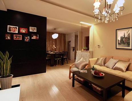 半開放式客廳,有黑色照片墻作為隔斷。