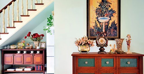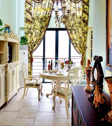 墻身以淡雅的綠色調(diào)打底,濃郁的歐式符號(hào)構(gòu)造浪漫情調(diào),裝飾重點(diǎn)放在家具顏色、造型以及裝飾物上。