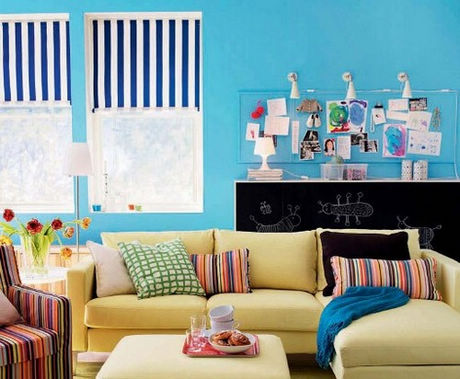 唯一要注意的是必須保持房間所有色彩的色調(diào)一致,這樣才會(huì)顯得更加和諧有品位。 搭配效果:天藍(lán)色的墻壁田園與奶黃色的沙發(fā)搭配非常舒適,藍(lán)與黃大面積色塊配比也同樣給人以童真的幻想。條紋布藝和格子布藝增強(qiáng)了空間的動(dòng)感,讓平靜的奶黃色、天藍(lán)色也跟著五彩斑斕的條紋跳動(dòng)起來。 |