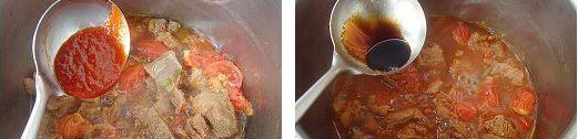 7、撇去浮沫,轉(zhuǎn)小火燉煮1小時。 8、將番茄打十字刀入沸水中汆燙去皮,切塊。 9、放入一半番茄塊繼續(xù)漫燉。 10、鍋置火上少許油燒熱,倒入番茄醬、調(diào)入鹽2勺、糖2勺,翻炒至出紅油。 11、將番茄醬加入牛腩中。 12、待湯汁濃稠后調(diào)入少許老抽慢燉3-5分鐘即可盛出裝盤。