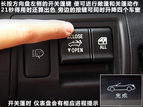 IS250C的開篷時(shí)間為21秒,關(guān)閉所有車門后,按住方向盤左側(cè)的OPEN鍵,頂篷便會(huì)自動(dòng)開啟。開篷或關(guān)篷時(shí),儀表盤上會(huì)有進(jìn)程提示,完全無需盯著它看是否完全打開。開篷鍵右側(cè)的ALL按鍵可以實(shí)現(xiàn)四個(gè)車窗全部開啟或同時(shí)關(guān)閉,行駛時(shí)關(guān)閉所有窗戶,前排人員不會(huì)被風(fēng)吹到,而后排乘客建議做好發(fā)型被吹亂的準(zhǔn)備。
