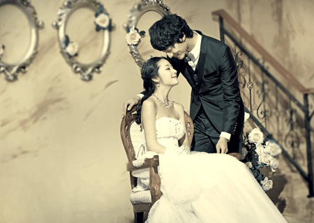 韓式婚紗照元素一:坐姿 不管哪個國度的婚照,相依而坐是必不可少的pose之一,似乎坐著更有限制,在動作上很難有所發(fā)揮,其實只要通過坐姿的變化或是改變坐的環(huán)境,效果會有很大的差距。