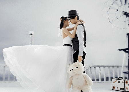 夫妻雙方同向站立,多采取側(cè)面姿勢,相面而笑,此方法一則可以變換角度,展示新人最溫馨的一面,二則蘊含甜蜜生活的含義。