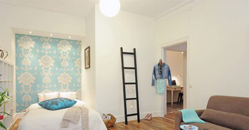 客廳和臥室在同一區(qū)域,開(kāi)放式的書(shū)架可以放置物品。