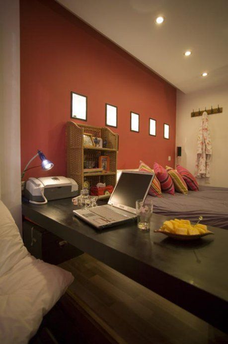 床臺(tái) 咪咪家的床臺(tái)高40厘米,在床的靠窗一邊設(shè)置了一長(zhǎng)條書(shū)桌,在臺(tái)上放個(gè)軟墊就能很舒服地上網(wǎng)。書(shū)桌的另一邊在床臺(tái)下,坐上一把平常高度的椅子剛好可以舒服地在書(shū)桌上寫(xiě)作。第一次看到的時(shí)候真是不禁為這個(gè)設(shè)計(jì)叫絕,既節(jié)省空間,又能夠讓主人隨自己喜歡的姿勢(shì)來(lái)使用。