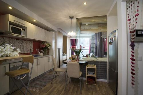 廚房+餐廳設(shè)計(jì) 這樣的細(xì)節(jié)在小家里到處可見(jiàn)。一進(jìn)門左手邊有一塊掛在墻上的隔板,平日里收起來(lái),逢到簽收快件、雨天放傘等需要的時(shí)候就可以隨時(shí)放下。女主人還喜歡在上面收掇一下蔬菜,作為臨時(shí)備餐臺(tái)。咪咪在旁邊擺了一把高腳的吧臺(tái)椅,看來(lái)偶爾夜闌人靜自己小酌一杯也是個(gè)好去處。 浴室用玻璃圍擋之后,邊角四方方顯得突兀尖銳。咪咪順著邊沿用木板做了一個(gè)圓角的小桌,不大不小剛夠兩人平時(shí)吃飯用。每逢說(shuō)其這個(gè)設(shè)計(jì)女主人總是十分得意。