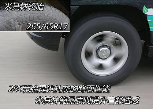 前文提到的噪音問(wèn)題在輪胎上也得到體現(xiàn),寬大的265輪胎提供了較佳的路面性能,而安靜的胎噪則源自米其林輪胎一貫的輪胎質(zhì)地與花紋設(shè)計(jì)。在注重性價(jià)比的國(guó)產(chǎn)車(chē)之上能夠見(jiàn)到此類(lèi)高檔次輪胎的機(jī)會(huì)并不多。17寸的輪轂采用散熱性能較佳的合金材質(zhì),并且輪輻空間較大,有效幫助制動(dòng)系統(tǒng)散熱。