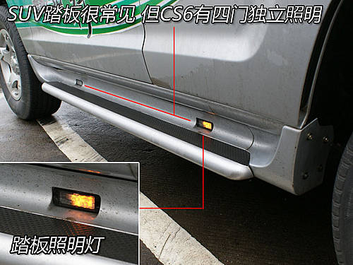 提升CS6人性化感受的地方還有蹬車(chē)踏板處的設(shè)計(jì),相比一般的SUV車(chē)型,長(zhǎng)豐獵豹CS6不僅在表面提供了橡膠防滑層還在每個(gè)車(chē)門(mén)之下安裝了照明燈,避免了踩踏失誤造成危險(xiǎn)的隱患。只要車(chē)門(mén)開(kāi)啟,對(duì)應(yīng)位置的門(mén)下照明燈即刻開(kāi)啟,而此燈的另一個(gè)作用就是在停車(chē)離開(kāi)時(shí),點(diǎn)亮的提示燈可提醒您此處的車(chē)門(mén)尚未關(guān)好,還有一定的警示作用。