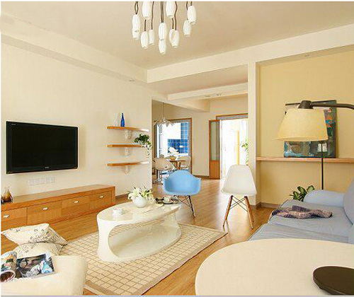 編輯點(diǎn)評(píng):客廳由白色與藍(lán)色,實(shí)木與塑膠組成,視野開闊,實(shí)木家具全部為原木色,整個(gè)空間清新雅致。