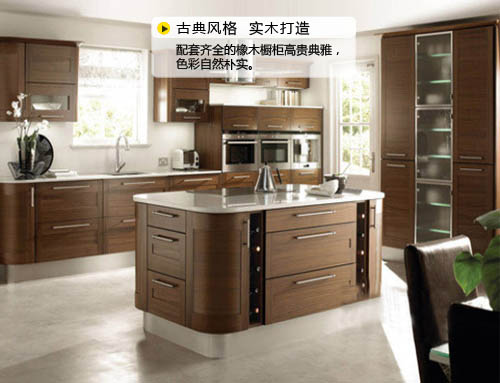 編輯點評:配套齊全的橡木櫥柜高貴典雅,色彩自然樸實。