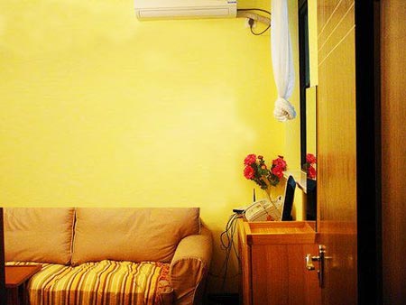 休息區(qū)“飾”前:簡單的家具、沙發(fā),留有一面空白的背景墻,顯得空曠而單調(diào),何不裝飾一下呢?哪怕一幅裝飾畫、一個(gè)鐘表。