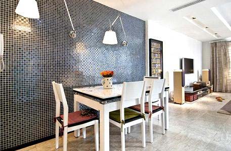 客餐廳設(shè)計(jì):黑白馬賽克拼接的餐廳背景墻,配上兩站吊燈,現(xiàn)代質(zhì)感瞬間體現(xiàn)。
