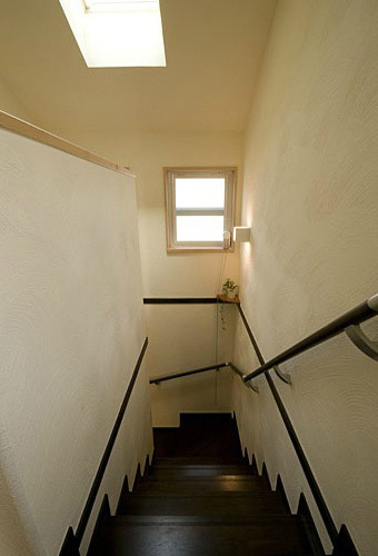 樓梯扶手。材質(zhì)是松木,在關(guān)鍵部分再用鐵片加固。沿著樓梯往上的墻壁,也是同樣的內(nèi)嵌設(shè)計,不過這里還加上了小玻璃門,因為里面主要放的是比較貴重的飾品和我爺爺留下來的紀念物。