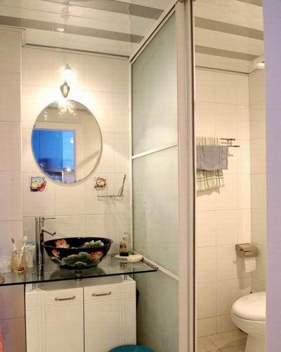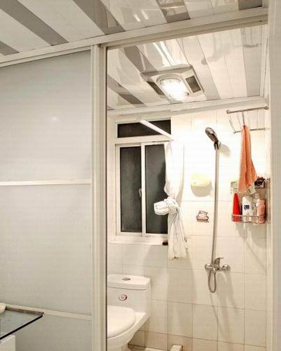 衛(wèi)生間的濕區(qū),是座便器和淋浴房,用磨砂的玻璃移門隔斷。