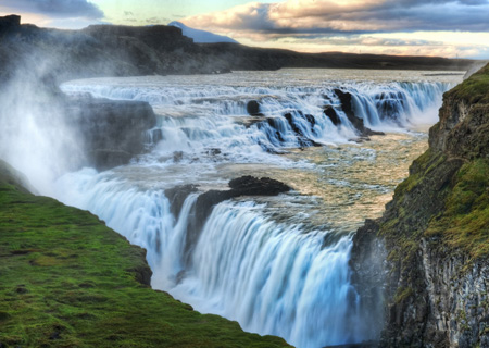 也許您曾在日本感受過在雪中泡溫泉,但那里的溫泉都是小小的池子,一個個排開,而在藍湖,你可以泡在整個湖里面。泡在暖融融的湖水中,視野是那么的開闊,雪花飄飛在暖暖的煙霧之中,沒等飄落到身上就迫不及待地變成了水滴。此時心中再無其他的欲求,只是閉上眼睛盡情享受大自然的賜予。 此外,這里的溫泉泥也很著名,由于冰島是多火山國家,而藍湖正是位于一座死火山上,地層中有益的礦物質(zhì)沉積在湖底,水性好或運氣好的人,在挖到白顏色的泥時會歡呼不已,因為這種泥對美顏健體有很好的功效。 黃金瀑布位于雷克雅未克市東北123公里處,距間歇噴泉約10公里,為歐洲著名瀑布之一。黃金瀑布是冰島最漂亮的瀑布之一,是冰島人最喜愛的瀑布。 該瀑布氣勢宏大,景色壯觀。湍急的水流順勢而下,注入峽谷,落差達50多米,發(fā)出震耳欲聾的轟鳴。 陽光下,在蒸騰的水霧中,布滿閃著金光的點點水滴,亮艷的彩虹若隱若現(xiàn),仿佛整個瀑布是用黃金造就,故而得名“黃金瀑布”之美稱。 傾瀉而下瀑布濺出的水珠彌漫在天空,在陽光照射下形成道道彩虹,仿佛整個瀑布是用金子鍛造成的,景象瑰麗無比,令游客留連忘返。 冬天里的黃金瀑布,雖然沒有滿目的綠意做伴,沒有耀眼的陽光映襯,沒有成群的飛鳥相綴,少了一份夏日的張狂,但在茫茫白雪中,顯得溫存含蓄,充分流露了瀑布溫情的那一面。 |