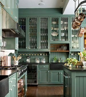綠色的廚柜本身充滿(mǎn)了優(yōu)雅感,不僅提升了廚柜的質(zhì)感,清新的色調(diào)也為廚房增加了一抹自然風(fēng)味,放置上潔白的瓷器,加強(qiáng)低調(diào)奢華感。