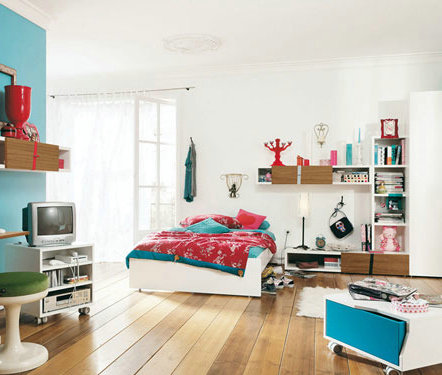 撞色的搭配非常時尚,淺藍(lán)色與紅色飾品的點綴能調(diào)動人內(nèi)心的熱情,是好熱鬧的人群鐘情的色彩。移動中的矮柜能隨時變換家裝布置,并盡量利用墻面來擴(kuò)充收納空間,讓整個家顯得寬敞明亮。