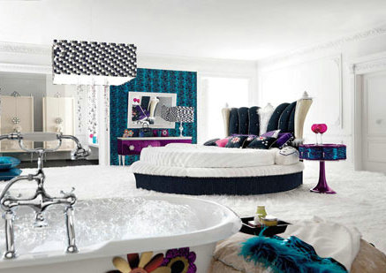 這間單身公寓的風(fēng)格極盡奢華之能事,點(diǎn)綴在白色臥室中的藍(lán)色和紫色,亮麗而搶眼,這兩種色彩都會(huì)給人以高貴華貴的感覺,加上其神秘情緒,為空間增加了幾分唯美成熟的氣質(zhì)。 |
