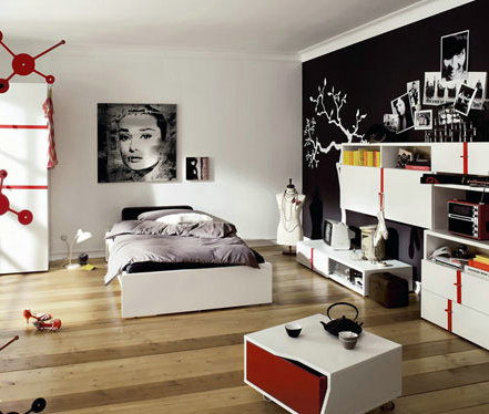 相比前面的那間女性臥室,這個(gè)房間的色調(diào)少了可愛的成分,多了沉穩(wěn)的氣質(zhì)。在中性色為基調(diào)的臥室中,嘗試用鮮艷的紅色作為家裝配角,雖然在整體空間里所占的比例不多,為家居生活注入生命活力。在這樣的配色中,一款立于墻面的白色壁柜,臥室的視覺感在剎那間鮮明起來。