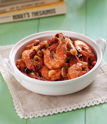 大蝦500g、蔥姜幾片、干紅辣椒和花椒適量、大蒜幾瓣、熟花生米適量、油,生抽,鹽,料酒,淀粉少許。