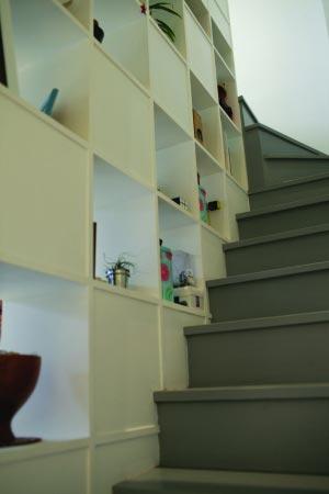 書架 樓梯的旁邊就是頂天立地的大書架,順便就做了樓梯扶手,完全不影響放書,而且留出幾格鏤空,就解決了樓梯的采光問題。 愛書人的書架自然也非常高大,可以容納很多書與雜志,以及主人喜歡的各種小收藏,樣式則非常普通,就是白色的木格子,避免了視覺上的凌亂。為了爬書架而買的三層小梯子,沒用來爬幾次,現(xiàn)在卻被用來做了置物架,幾摞書,兩三本當(dāng)月的雜志,一盆小小的綠色盆栽,讓這個(gè)小梯子得到了意料之外的新職業(yè),擺足了“架子”。 值得一提的是,洗手間的門做成了雙開式,大大節(jié)省了開關(guān)門的空間。