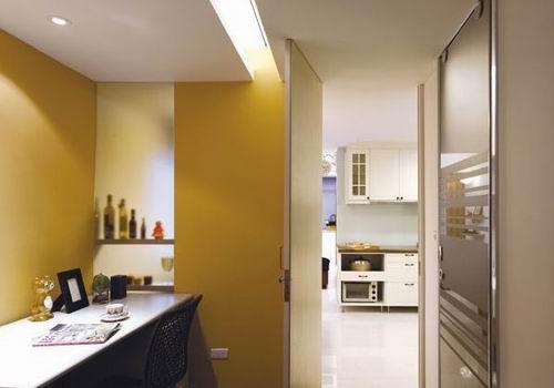 餐廳的展示擱架區(qū)后面是小書房,用地板作為地面裝飾,和客廳餐廳廚房的地磚區(qū)分開。