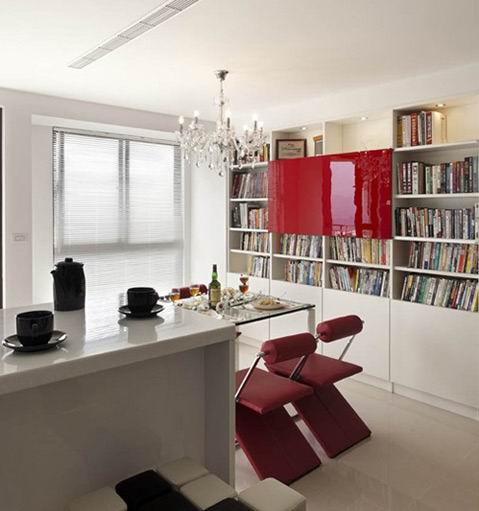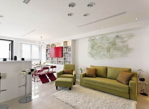 設(shè)計(jì)師善用空間的先天優(yōu)勢,具得天獨(dú)厚的綠意山景與大面采光,遂將室內(nèi)以白色為基調(diào),襯托空間的其它優(yōu)勢。入門玄關(guān)處,使用清玻璃貼花紋作為端景柜,營造出一小處的玄關(guān)空間,又能不影響視覺的開闊效果。進(jìn)入到客餐廳,開放式設(shè)計(jì)讓光線得以四處流竄,白天不開燈也能享有充足的光源。設(shè)計(jì)師利用家具與色彩巧妙的區(qū)隔空間,客廳以抹茶綠沙發(fā)與墻面的裝飾點(diǎn)綴,活絡(luò)鮮明的視覺美感。