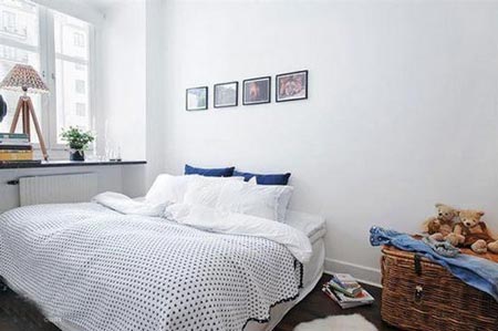 亮點5:臥室中大量運用了白色,加入了一抹藍色使空間更有藍天白云的清透感。這里舍棄了黑、紅這兩種過于深的顏色,為的是讓心的感覺更加輕盈。 |