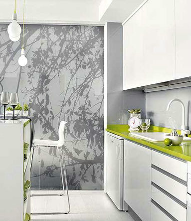 由于戶型空間的限制,居住者將餐廳和廚房連為一體,實(shí)施全開放式設(shè)計(jì),并大膽地搭配上綠色的料理臺面,雖然此色彩所涉及的面積并不算多,卻能夠讓人眼前一亮。