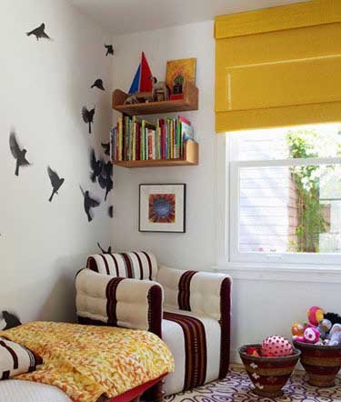 素色的墻面因自由排列的飛鳥而形成動感的視覺效果,與臥室里鮮亮的家具等搭配,顯得精彩十足,不僅增添了房間的趣味性,也讓臥室整個雀躍起來。