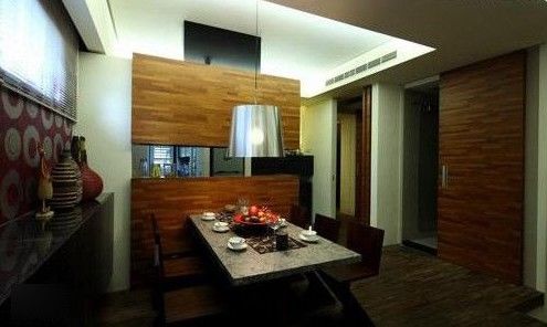 餐廳,包覆著通風(fēng)管的集層材立柱以擎天之姿矗立,營(yíng)塑空間的垂直向度,也劃分出客廳與餐廳的邊界。