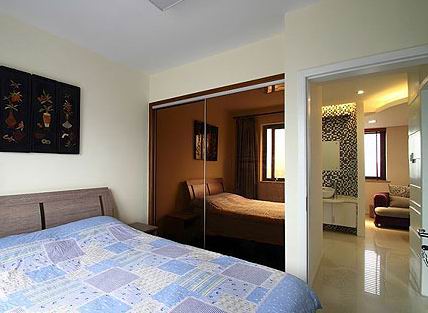 素雅溫馨的客臥,采用裝飾版畫作為床頭背景墻。茶色鏡面玻璃移門的衣柜顯得十分亮麗,鏡面的設(shè)計也能增加小戶型的空間感,