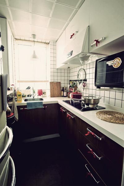 櫥房里漂亮的格子墻,在家居裝修的時候,很多人會問,用什么顏色的柜門比較好看?這應(yīng)該是漂亮的一例吧。考慮到廚房潮濕的環(huán)境,建議大家采用防火防潮材料的柜門。