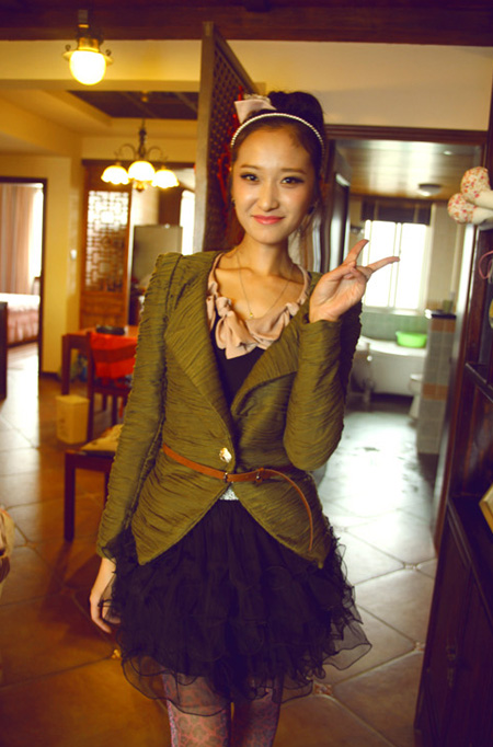 很淑女的一件黑色小禮服,套上件抓皺設(shè)計的綠色西裝外套,大V領(lǐng)把優(yōu)美的蝴蝶結(jié)都露出來,配上腰帶很是好看。