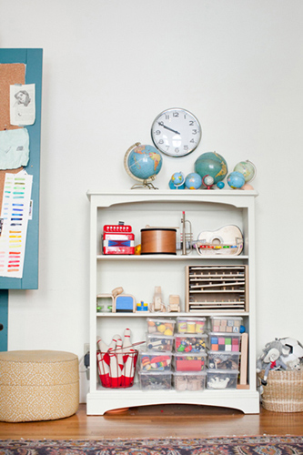 編輯點(diǎn)評(píng):書桌隔壁擺放的是小孩子的玩具,小件的玩具用收納盒裝好,整齊地放好,常用的玩具也建議放在矮一點(diǎn)的那層,方便兒童拿取,對(duì)于不便收納的玩具,例如足球、布娃娃這些,則可以買一個(gè)籃子將其收好。