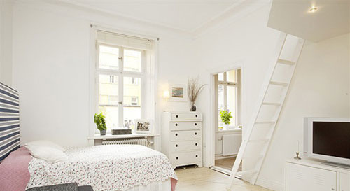 大量運(yùn)用白色的臥室空間中,一抹點(diǎn)睛的橫向條紋圖案具有拉伸視覺效果的作用,讓平日里的空間看起來明快大方。而一襲畫龍點(diǎn)睛的碎花床品,為臥室?guī)砬逍碌母杏X。整體干凈的色調(diào)營造出甜美、夢(mèng)幻的別樣風(fēng)情。