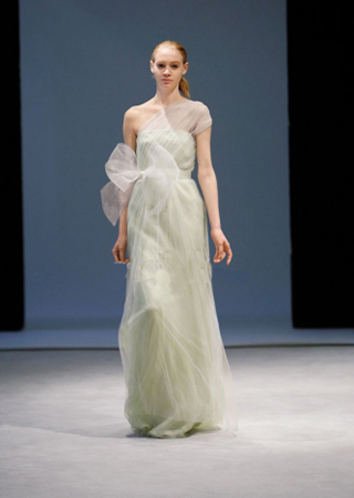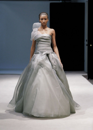 銀灰色婚紗并不多見(jiàn),成為VERA WANG今季婚紗設(shè)計(jì)的亮點(diǎn)。這款婚紗雖然采用經(jīng)典的A字廓形,但肩頭的薄紗蝴蝶結(jié)令它頓生風(fēng)姿。
