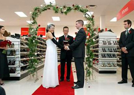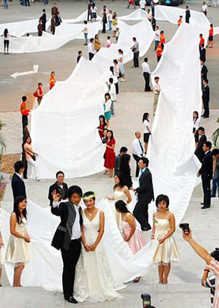國(guó)新娘身穿200米長(zhǎng)的婚紗,創(chuàng)下新的世界紀(jì)錄! 來(lái)自中國(guó)廣州的一位新娘的拖裙長(zhǎng)達(dá)219碼,創(chuàng)下世上最長(zhǎng)婚紗拖裙新紀(jì)錄。這位中國(guó)新娘強(qiáng)調(diào),這條帶拖裙的禮服長(zhǎng)超過(guò)600英尺,重超過(guò)220磅。謝其云的這張照片是在她婚禮當(dāng)天在廣東省會(huì)廣州的一家酒店前面拍的。根據(jù)吉尼斯的測(cè)量,最長(zhǎng)的這條婚紗拖裙長(zhǎng)1362米(4468英尺5.94英寸),是塞浦路斯帕福斯的安德烈亞斯在2007年2月做成。 這一對(duì)在邁克斯鞋店結(jié)婚! 一想到能把打折商品得到手,誰(shuí)不興奮?新娘麗莎決定要把這種興奮同得到男友的興奮合二為一。她解釋說(shuō),邁克斯鞋店是她的幸福之地,于是在密歇根州的快樂(lè)山市的一家邁克斯鞋店,她在8號(hào)鞋的通道嫁給了德魯埃里斯。這位自稱“邁克斯迷”的新娘穿著白色抹胸雪紡禮服,帶著黑色手套,穿著亮綠色角斗士風(fēng)格的涼鞋。拓寬的通道、纏繞藤蔓的拱門、帶著紅色蝴蝶結(jié)的白色座椅突出了婚禮傳統(tǒng)的一面,婚禮現(xiàn)場(chǎng)有弦樂(lè),也有不停拍照的攝影師。前來(lái)購(gòu)物的人充滿好奇,他們都停止討價(jià)還價(jià),駐足觀看。 |